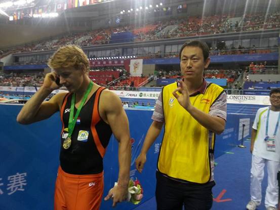 引领世锦赛单杠冠军、荷兰名将宗德兰德接受媒体采访