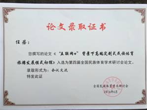 2016年6月2日-5日,由成都太阳成集团tyc151cc主办、吉首大学承办的第四届全国民族体育学术研讨会在湖南吉首大学召开。本次大会公司太阳成集团tyc151cc的任蓓和黄龙两位教师参加,共有两篇学术论文被大会录用,其中黄龙老师做专题报告一篇,并荣获“优秀论文”二等奖。参会过程中,公司教师准备充分、认真学习、积极讨论,顺利圆满的完成了专题报告和会议交流任务,并获得了相关专家的好评。