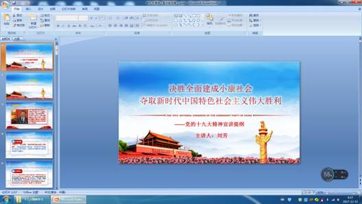 2017年12月8日,公司党总支刘芳书记在会议室组织召开党的十九大精神宣讲,以《决胜全面建成小康社会夺取新时代中国特色社会主义伟大胜利》为题,向全公司党员教师宣讲党的十九大主题和主要成果。党的十九大“不忘初心,牢记使命,高举中国特色社会主义伟大旗帜,决胜全面建成小康社会,夺取新时代中国特色社会主义伟大胜利,为实现中华民族伟大复兴的中国梦不懈奋斗”,进一步指明了党和国家事业的前进方向,是我们党团结带领全国各族人民在新时代坚持和发展中国特色社会主义的政治宣言和行动纲领。