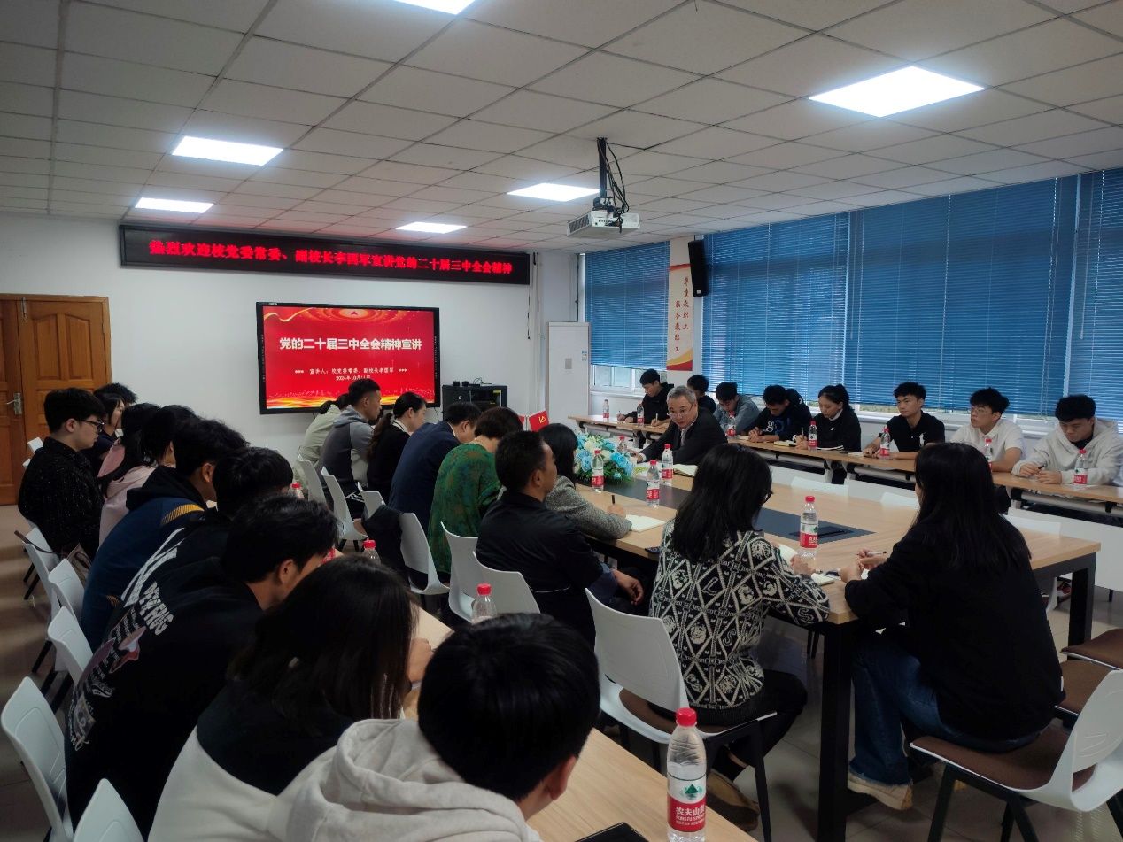 为深入学习贯彻党的二十届三中全会精神和习近平总书记重要讲话精神,深刻领会党的二十届三中全会报告的重大政治意义、理论意义和现实意义,10月11日,公司召开学习贯彻党的二十届三中全会精神宣讲会,公司党委常委、副董事长李国军做专题宣讲,党总支书记黄谦主持,党总支全体委员、系部主任、学团办主任、工会代表、全体员工党员参加专题学习。