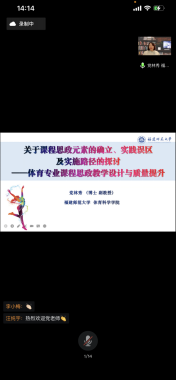 2022年9 月30日下午,《关于课程思政元素的确立、实践误区及实施路径的探讨》的线上学术讲座在公司顺利举行。本次讲座邀请福建师范大学体育科学公司的党林秀副教授进行主讲,公司体育专业办公室杨辉主任做讲座主持,参会人员有体育专业全体教师和太阳成集团tyc151cc硕士研究生共同参加。