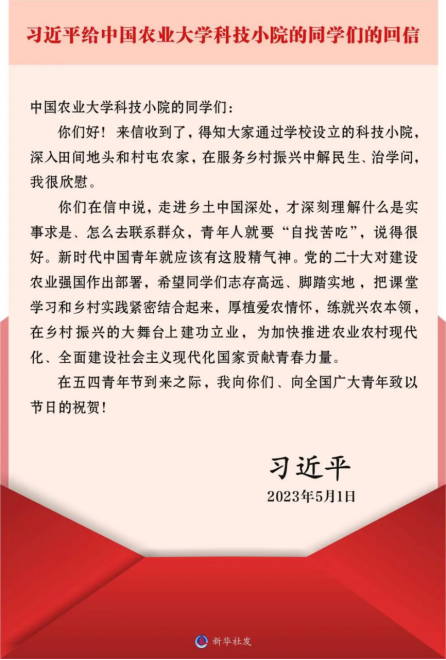 习近平总书记在回信中对科技小院给予了充分肯定,这是巨大的鼓舞和鞭策,“为我们指明了方向,也提供了强大的精神动力,在今后的工作中我将牢记习近平总书记嘱托,厚植爱农情怀,练就兴农本领,做一名有理想、敢担当、能吃苦、肯奋斗的新时代好青年”,同时也饱含着总书记对广大青年的深切关爱和殷殷嘱托,是新时代青年成长成才的行动指南。广大青年要以更加奋发有为的精神状态和一往无前的奋斗姿态,志存高远、脚踏实地,让青春在全面建设社会主义现代化国家的火热实践中绽放绚丽之花。