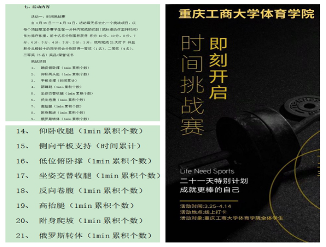 21天养成一个好习惯,从3月25日起,活动每天将会出一个挑战项目,以每个项目限定参赛员工在一分钟内完成的次数(或标准动作坚持时间)作为排序依据。每天锻炼一分钟,健康生活每一天,他们在锻炼中挥洒汗水,在坚持中成长,运动使人拥有健康的体魄。经过长达21天的比赛,女队和男队竞争都比较激烈,终于在4月14日分出胜负,谭宇杭和黄文鳐获得第一名。毕洁庆同学遗憾没能拿第一名,他说:“我虽然没能拿到第一名,但是我锻炼身体,养成一个良好的习惯。”