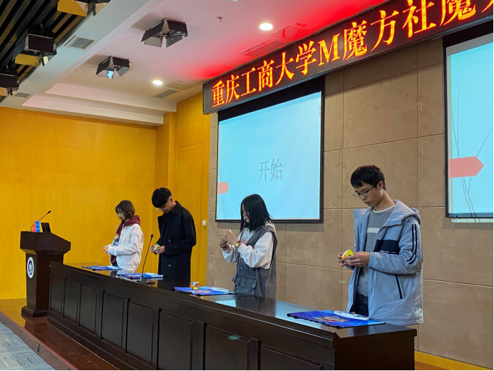 下午两点,比赛在同学们高涨的热情中拉开了帷幕,参赛者在工作人员的安排下有序的进行抽签分组,同时由专门打乱魔方的同学按公式打乱魔方,在具体的工作人员分配到比赛桌上,选手到位,准备就绪后由裁判宣布开始,并计时,同学们,在比赛过程中,沉着冷静,也并没有做出违规行为,比赛现场环境十分安静,参赛者还原魔方后示意裁判,同时裁判完成计时,经统计,参赛者中有人在短短几秒钟内就还原了魔方,还有许多只花了十几秒的优秀参赛者,在完成初赛复赛后,最终的决赛正是更是令人震惊,同学们,完成魔方还原的时间仅相差无几,还好裁判员火眼金睛,最终决赛选出了一、二、三等奖的获得者,并由M魔方社会长及管理人员为获得者颁发了奖状和奖品。