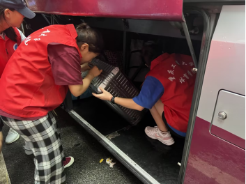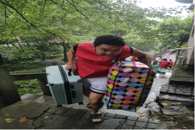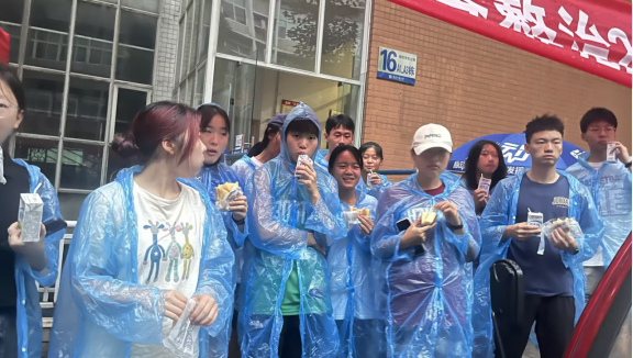 清晨五点过半,天还蒙蒙亮,天上下着瓢泼大雨,50多名志愿者与外国语公司老师与同学在菊园集合,对从江北校区乘车过来的外国语公司大一新生进行公寓搬迁服务。
