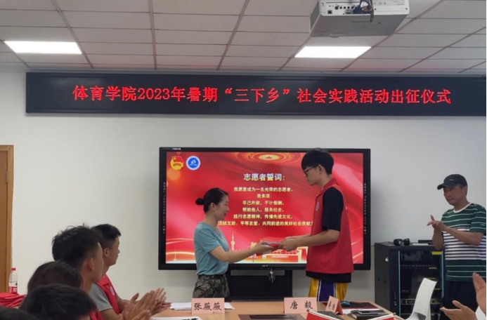 随后,傅杨老师带领全体实践团成员进行出征宣誓,他们表示,将秉承“守正坚卓,砺学精技”的院训精神,在社会实践中彰显体院人的意志品质,为社会贡献智慧和力量。最后,张薇薇副书记为本次暑期“三下乡”社会实践队伍授旗。