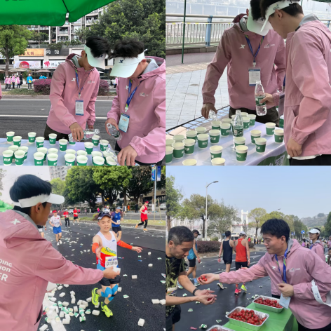凌晨4点30分,全体志愿者在校前广场整装出发,前往主要负责点南滨路17.5km、35km两个关键补给站开展服务工作。活动中,志愿者们为参赛选手提供饮水饮料、喷淋降温、能量补给、冷喷等服务。体院志愿者们尽职尽责,积极为参赛运动员加油助威,展现了青年学子最美笑脸和良好的精神风貌,不仅高质量完成工作任务,还积极参与赛事的后勤保障工作,协助组织方进行场地布置、物资搬运等工作,赢得了赛事组织方、参赛运动员及现场观众的高度评价和赞扬。