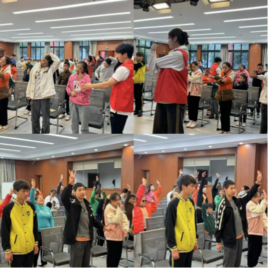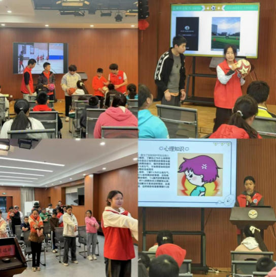 活动当天,志愿者们身着醒目的红马甲,以饱满的热情投入到与孩子们的互动中。他们通过PPT生动地讲解篮球、足球知识以及啦啦操等体育项目,并融入心理健康知识等内容,向孩子们传递着运动的快乐与激情。在志愿者的带领下,孩子们不仅学习了相关知识,还亲身体验了拉伸热身等运动环节,感受着体育带来的力量与成长。