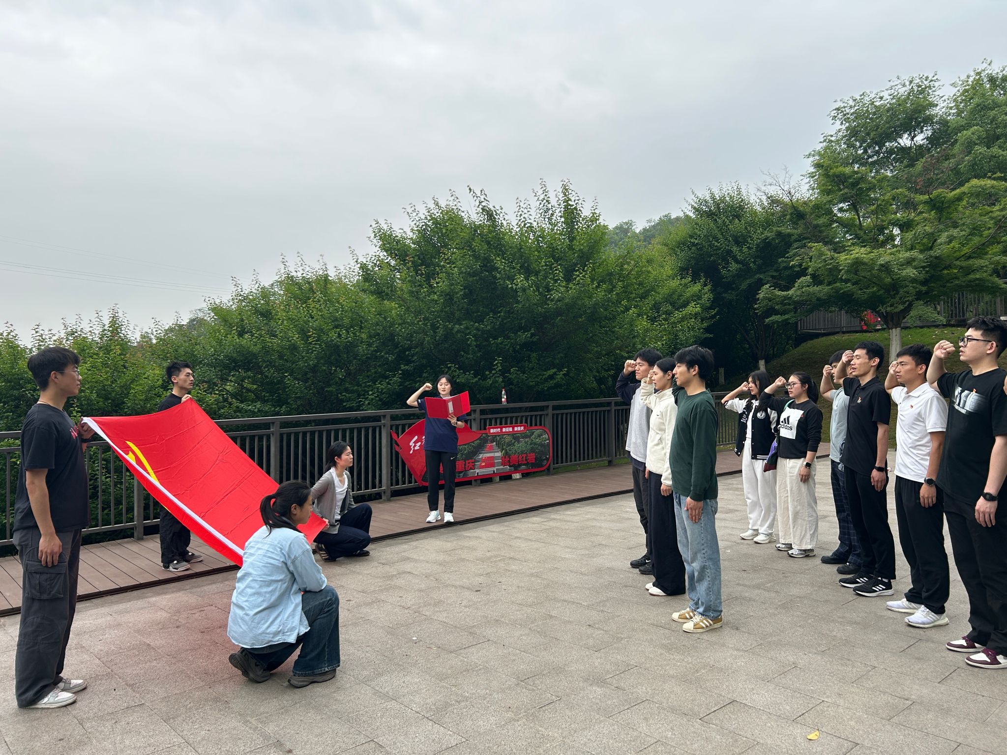参观结束后,党支部在纪念馆广场举行了庄严的新党员入党宣誓仪式。仪式在雄壮的《国际歌》中开始,员工党支部书记胡进鸿宣读新党员名单,党员林丽萍、高泉、代义铭面向党旗高举右拳进行了转正宣誓,随后胡进鸿为新党员佩戴党员徽章,新党员代表高泉做了代表发言结束,全体党员一同重温入党誓词。胡进鸿寄语全体党员,我们要传承发扬红岩精神,在学习和实践中锤炼党性品格,要将红色基因融入专业实践,在赛场内外展现党员担当,为培养德智体美劳全面发展的社会主义建设者贡献力量。