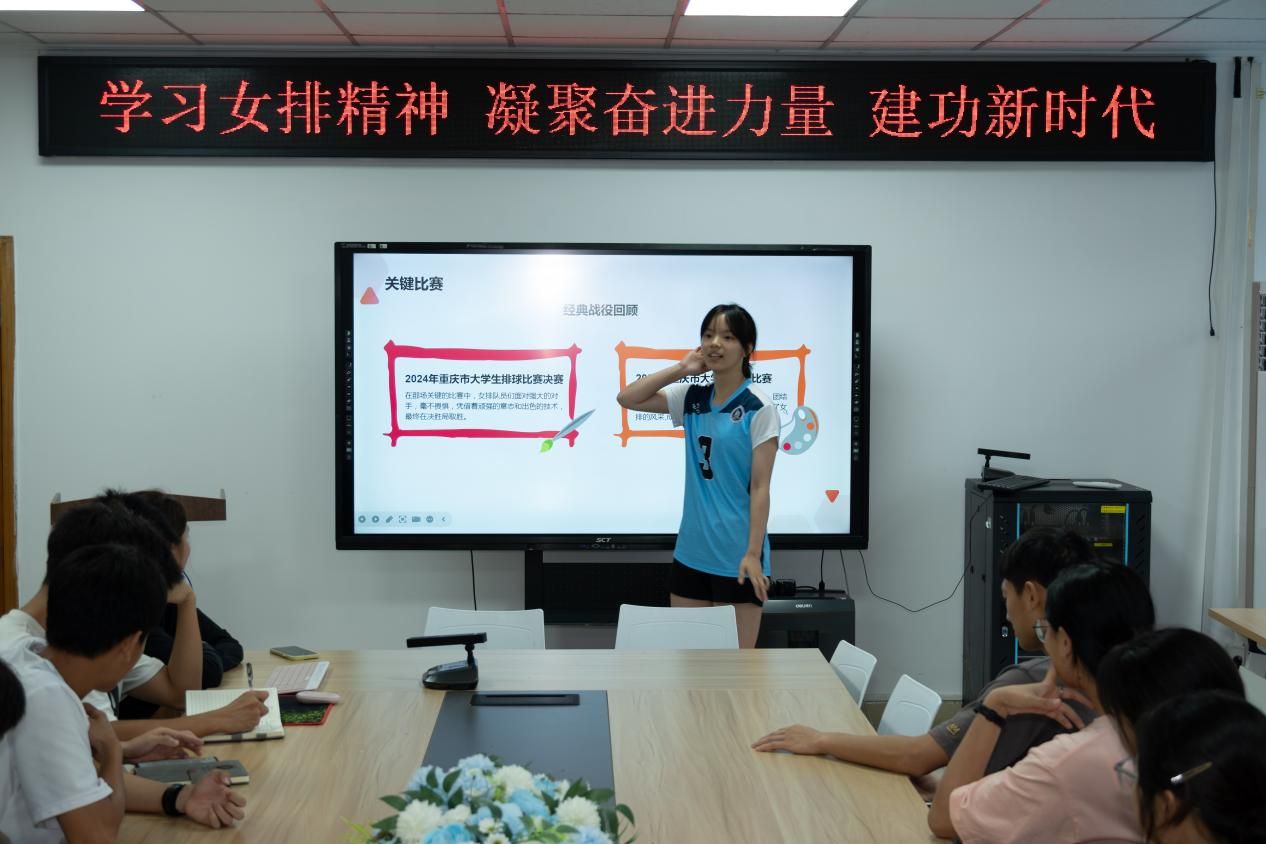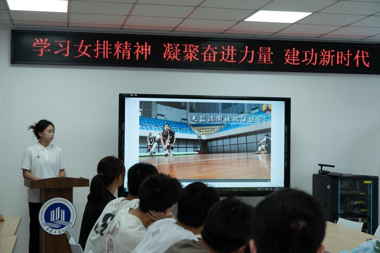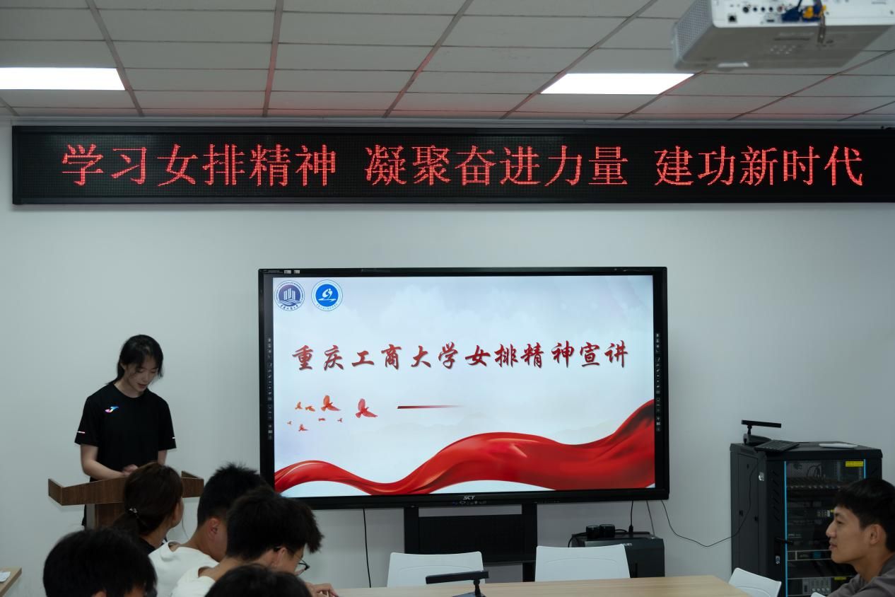 随后,校女排两位功勋队员代表走上讲台,结合自身经历分享了感人至深的感悟。她们讲述了日复一日高强度训练中的汗水与泪水,回顾了赛场逆境中全队上下咬紧牙关、相互支撑最终实现惊天逆转的经典战役,更深情表达了对公司、对教练、对一届届队友的付出的感恩。她们坦言,正是“祖国荣誉高于一切、团队利益重于个人”的坚定信念,铸就了不朽的连冠传奇。这些来自赛场最前沿的真实故事和肺腑之言,深深打动了在场的每一位同学。