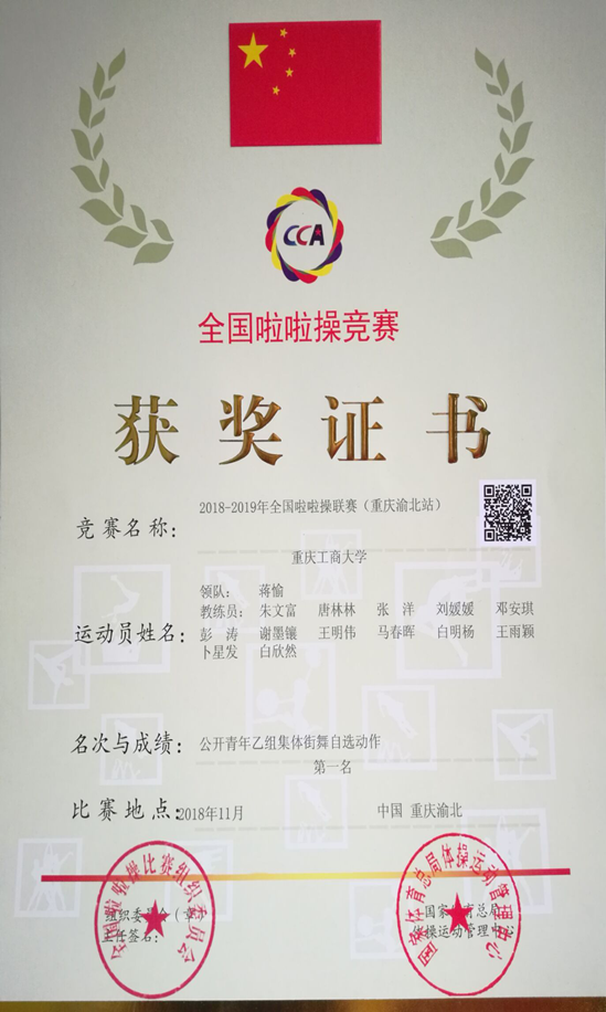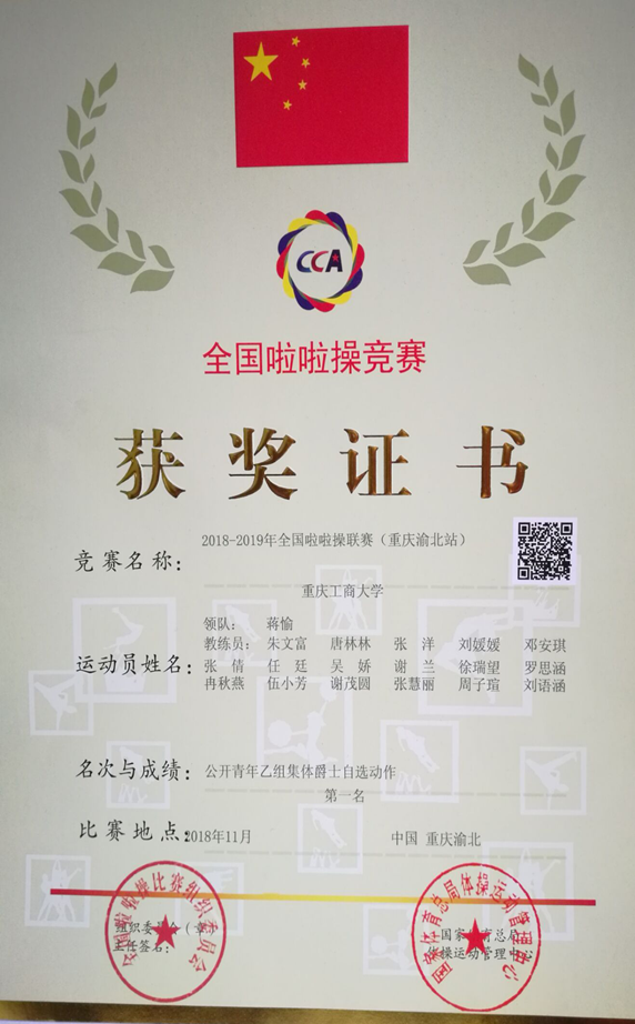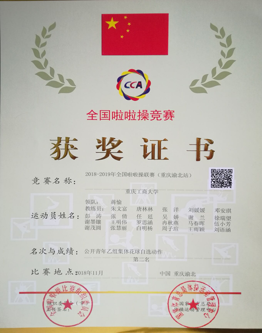 2018年11月,太阳成集团tyc151cc啦啦操代表队在2018—2019全国啦啦操联赛(重庆渝北站)中获得优异成绩,荣获公开青年乙组集体爵士自选动作冠军、公开青年乙组集体街舞动作冠军、公开青年乙组集体花球自选动作亚军等两项冠军、1项亚军。领队蒋愉,教练员朱文富、唐林林、2015级体育教育张洋、刘媛媛、邓安琪,参赛队员有:2016级体育教育专业(冉秋燕、徐瑞望、罗思涵);2017级体育教育专业(彭涛、谢墨镶、王明伟、白明杨、吴娇、谢兰、伍小芳、谢茂圆、张慧丽);2018级卜星发。
